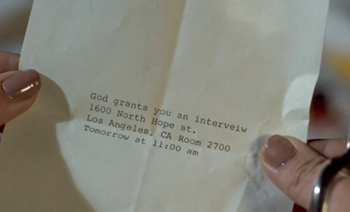 The plot of the movie begins with a simple invitation. Jerry Landers (John Denver) receives a letter from God (George Burns) inviting him to an interview at: